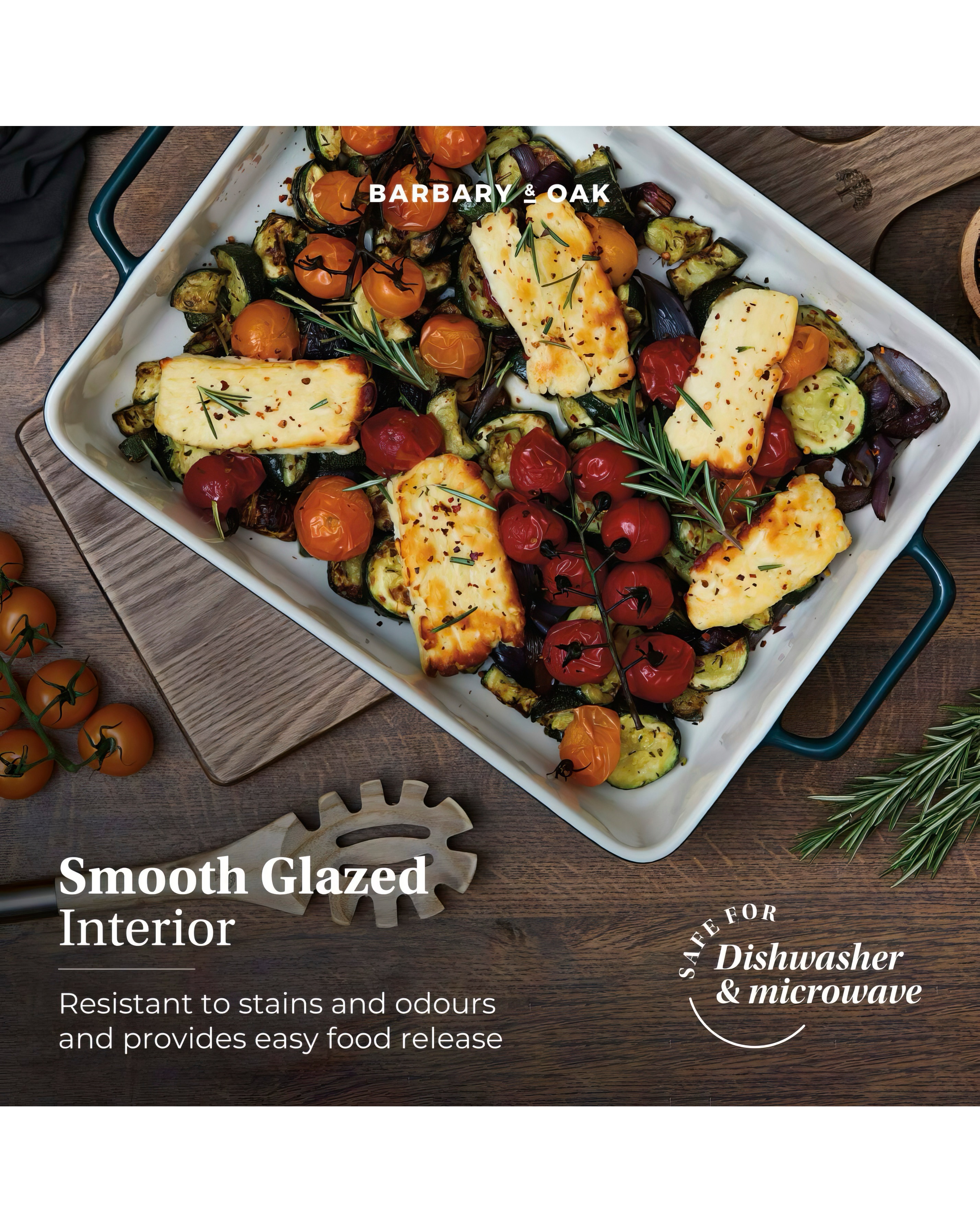 Create delicious family sized meals and showcase your favourite recipes in style with this Large Rectangular Baking Dish from Nattura by Barbary and Oak. Effortlessly crafted from durable stoneware for long-lasting quality, heat is evenly distributed across the dish to ensure food is thoroughly cooked with no heat spots, whilst it also retains heat to keep food warmer for longer. The luxurious agave colours make it the perfect centrepiece for any table setting and it has easy grip handles on each side for simple oven to table serving. The smooth glaze interior provides easy food release for simple cleaning and requires little to no oil for healthier cooking. LARGE RECTANGULAR BAKING DISH: Ideal for creating delicious lasagne, roasted vegetables and family sized casseroles, it blends elegance and functionality to add a touch of style to any table setting. EASY GRIP HANDLES: Ergonomic handles on either side of the dish provide a comfortable grip for oven to table serving even when wearing oven gloves. PREMIUM STONEWARE: Crafted from strong stoneware, the dish is resistant to cracks, chips and scratches for long-lasting quality - ideal for everyday use and special occasions alike. It can also withstand heats up to 240 for fuss-free cooking. SMOOTH GLAZED INTERIOR: The smooth glaze provides easy food release and ensures heat is evenly distributed across the dish for thorough cooking without hot spots and is resistant to stains and odours. 3 YEAR GUARANTEE: Professional Barbary & Oak quality with a 1 year guarantee & optional 2 year extension, subject to product registration online.