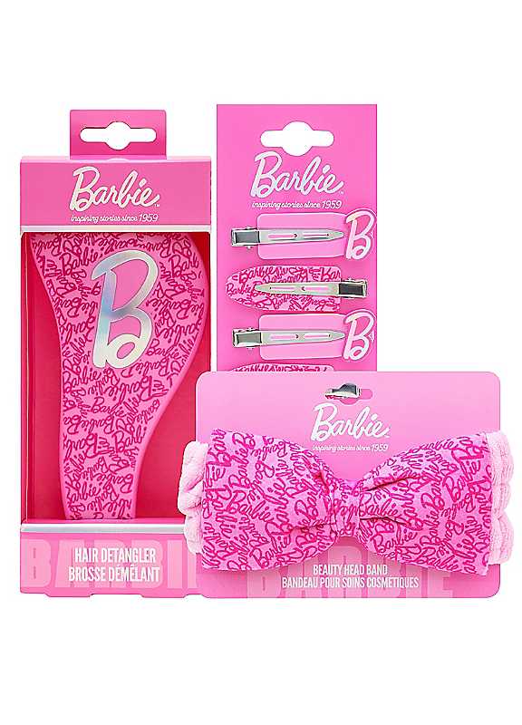 Crafted from ultra-soft, plush microfibre, this Barbie head band comfortably wraps around your head, keeping hair neatly away from the face. Perfect for makeup application or skincare pampering sessions. With its adjustable elastic band, it effortlessly fits most head shapes and sizes, ensuring a snug and secure fit every time Designed to leave your hair knot-free, this Barbie detangler brush has bristles of different lengths for detangling. With a softly curved handle & gold Barbie detail, it gives you full control when brushing. Use on wet or dry hair to help create the Barbie style of your dreams. These oversized clips with fun Barbie design leave your hair crease free. The perfect statement accessory and super practical too, designed to hold your hair in place when applying make-up. The design leaves no creases or kinks and won't snag hair.Character: BarbieWarning: Not suitable for children under 3 years. | microfiber hair wrap, detangling hair brush, pink makeup headband, pink headband bow, soft headbands, pink hair accessories, creaseless hair clips, hair kit