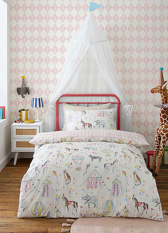 Step right up and witness the marvellous Bedlam circus time duvet cover set! Jump into a world of whimsy with a playful circus design, complete with a pastel harlequin surprise on the reverse. Made from easy care polyester, it's a high-flying act of comfort and fun. This set is a spectacular show under your covers - a circus extravaganza every bedtime! Bedlam is a fun-packed bedding range fit for free-roaming kids where bedrooms are places where imaginations run riot. Bold colours and bright, engaging designs turn any bedroom into a place where childhood adventures begin. Includes one pillowcase with the single set and two with the double.Machine washable at 40°CTumble dry on low heat100% Polyester (60% Recycled) | reversible duvet cover, childrens duvet covers, colorful duvet cover, double duvet covers, bedroom cover sets, printed duvet cover