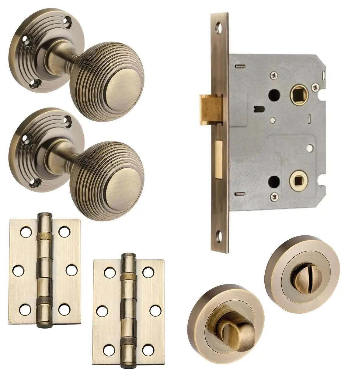 Beehive Antique Brass Mortice Bathroom Door Knob - 76mm - Rather than needing to buy all the different components to upscale your bathroom door separately, this cost-effective door pack gives you them all in one convenient product. Inside, you get two stunning beehive doorknobs, 2 x hinges, thumbturns, a mortice lock and the necessary fixings.