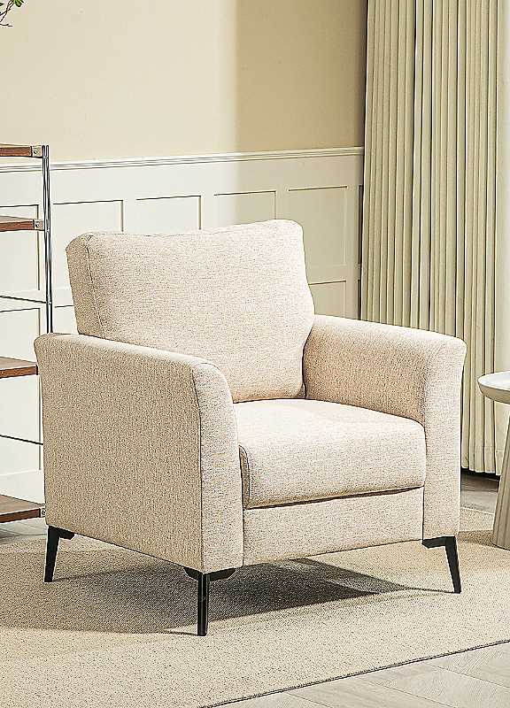 Create a cosy corner anywhere in your home with this soft and supportive small armchair. Featuring an 18cm thick high-density foam cushion and a linen-look fabric finish, it combines everyday comfort with understated elegance. Whether placed in the living room, bedroom, or hallway, it brings both function and style in a compact footprint. The soft, breathable polyester fabric gives a smooth, elegant texture and an inviting look that suits any interior. The tall back is designed to support your posture, making it easy to unwind after a long day. Foot pads on each leg help prevent marks and scratches on your flooring. Ideal as a living room chair, reading chair, bedroom accent, or guest room essential.Weight capacity: 125 kgAssembly Required: Simple and quick setupFeel Fabric (100% Polyester), Eucalyptus Wood, Foam, MetalOverall dimensions approx. 89H x 82W x 47D cmSeat dimensions approx. 47H x 52W x 47D cmBack dimensions approx. 53W x 48H cm Seat cushion thickness approx. 18 cmBackrest thickness approx. 14 cmArmrest dimensions approx. 74L x 13W cmArmrest to seat height approx. 18 cmLeg height approx. 15 cmPlease remember to measure your available space before ordering. If using on an un-carpeted floor we recommend rubber or felt protection pads be used under the legs to avoid damage to your floors. | comfortable chair home, chair comfort cushion, linen arm chair, small arm chair, ergonomic armchair