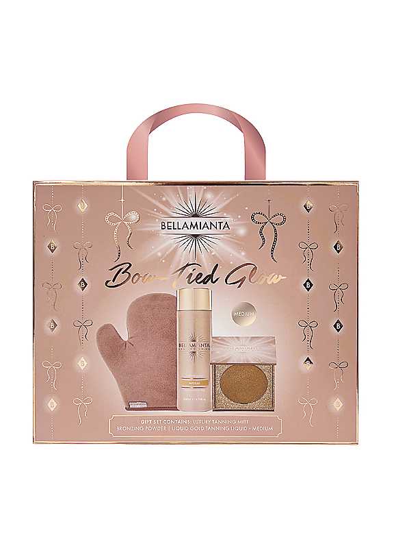 Unlock your luminous glow with the Bellamianta Bow Tied Glow Liquid Gold Tanning Gift Set. This 3 piece set includes our Luxury Liquid Gold Tanning Liquid, available in shades; Medium, Dark, and Ultra Dark, delivering a long lasting tan for up to 7 days and enriched with skin-loving ingredients for hydration and radiance. Achieve a seamless, streak-free application using the Double-Sided Luxury Velvet Tanning Mitt. Finish your look with our Illuminating Bronzing Powder, adding a lustrous sheen and subtle coverage for the perfect Bellamianta glow. This set is the ultimate gift for a flawless, sun-kissed complexion adding that sought after bella radiance just in time for the festive season!