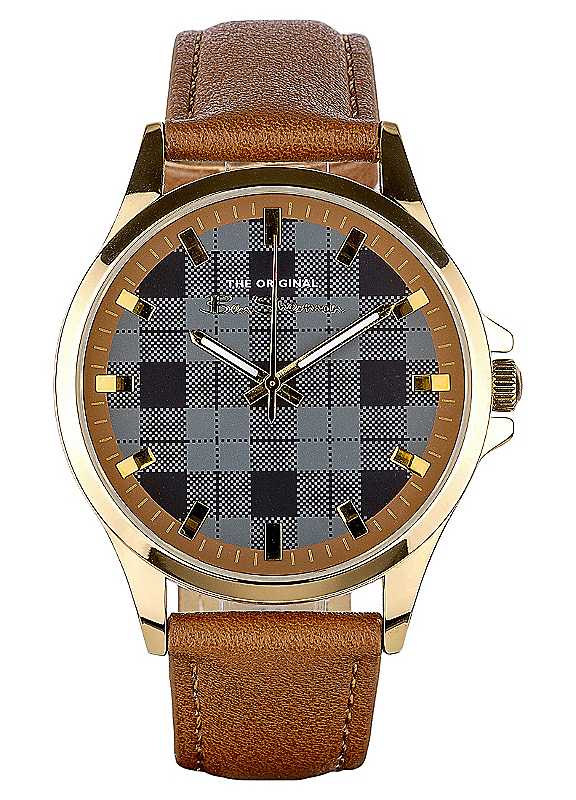 This Ben Sherman model has a Round Gold Polished case and is fitted With a Tan PU Strap. It has a Black Check Dial and comes with a watch box and 2 year warranty.3 HandsPC21 MovementAlloy IP GoldPolished 41 mm CaseMineral GlassBlack Check DialTan PU Strap | casual wrist watch, men's analog wrist watch, leather watch straps, tan leather strap watch, round dial watches, classic watches for men, black analog watch, mineral crystal watches, gold plated watches, quartz wristwatches