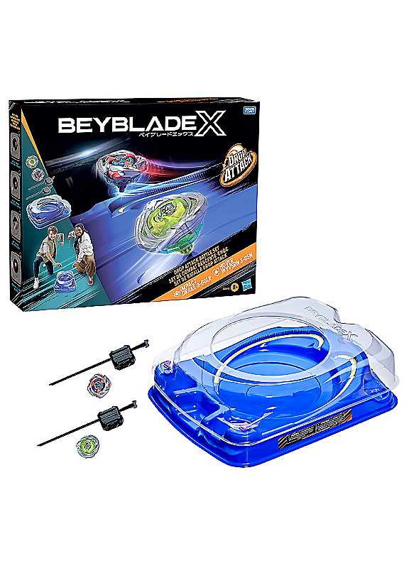 The Beyblade X Drop Attack Battle Set has all you need to begin battling - Beystadium, 2 tops and 2 launchers! The stadium's accelerator Rail can super-accelerate tops into an Xtreme Dash around the arena for crushing collisions and epic bursts. And with Drop Attack Beystadium, you can get a drop on your opponent's top - the stadium's elevated accelerator Rail can send Beyblade tops to a higher elevation, where they can drop down on their opponent's tops below!Use the two launchers to unleash the Impact Drake 9-60LR Attack Type top and the Hover Wyvern 3-85N Defence Type top in a frenzy of fury. Bladers launch their top against their opponent's scoring points - first to 4 points wins. Mix and match the interchangeable blade, ratchet and bit with the layers of other Beyblade X tops (sold separately) to build your perfect top.Hasbro Beyblade toys with authentic Takara Tomy die-cast metal tops make great children's presents for boys and girls ages 8 and up. Hasbro and all related trademarks and logos are trademarks of Hasbro, Inc.Age suitability: 8 years+Not suitable for children under 3 years old.