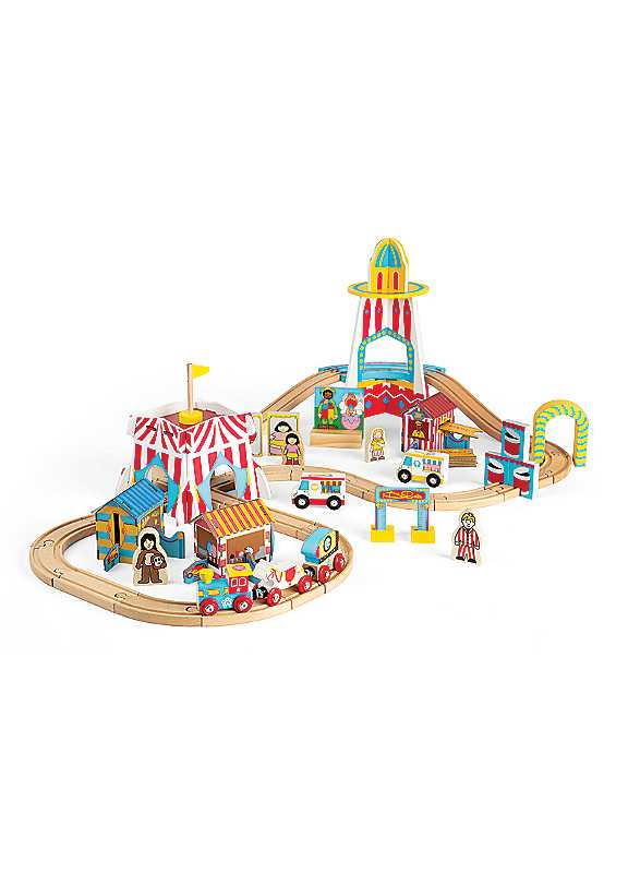 All the fun of the fair! Our action-packed 54-piece Fun Fair Train Set is bursting with accessories to bring carnival festivities to life. Little train drivers can guide their engines around the looping track, chugging under the circus tent, climbing up and down the helter skelter, and rolling past the ticket office. With so many playful details, this vibrant wooden train set is perfect for sparking imaginative adventures at the fairground!Age Suitability: 3 Years
