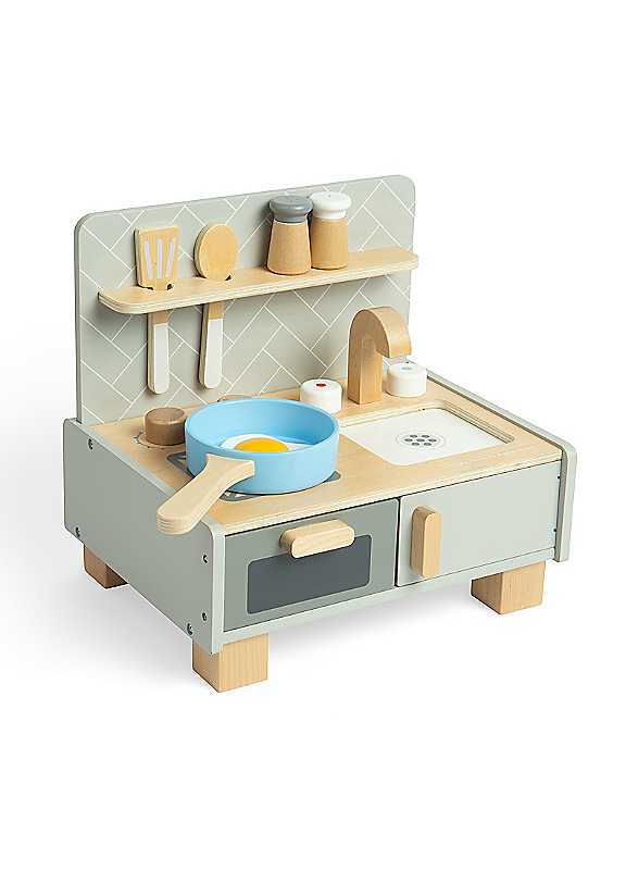 Tiny ones can cook up a family feast in their own miniature tabletop kitchen! This little play kitchen is built with a sink, cupboard, hob, and oven for children's culinary creations. It also comes with a frying pan, fried egg, two cooking utensils, and salt & pepper shakers to encourage imaginative play.Age Suitability: 3 Years