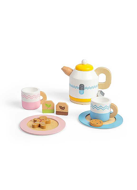 Pop the kettle on - it's time for a brew (or two)! Our gorgeous Wooden Tea Set for Two comes with a miniature kettle, two sets of cups and saucers, two tea bags, a chocolate chip cookie, and a gingerbread man biscuit.Age Suitability: 18 Months