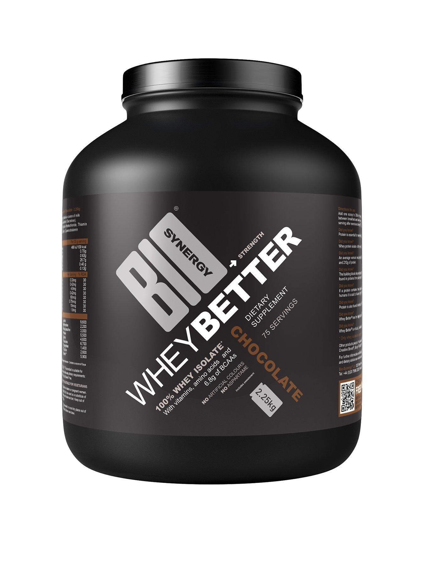 When it comes to your protein, quality makes all the difference. That's why Bio Synergy created Whey Better. 27.2g protein | 6.8g BCAAs | B-vitamins | 0 carbs | 0 Fat Whey Better is arguably the best whey protein shake you can buy. Whether your goal is to pile on lean muscle, strip away body fat or hit a whole new peak of fitness, you can trust Whey Better to help you succeed. Every 30g scoop of Bio Synergy's 100% whey isolate packs in 27.2g protein - more than any other in the market - plus a mighty 6.8g BCAAs and B-vitamins for improved energy levels and protein absorption. Whey Better is also proudly manufactured right here in the UK, using only premium-grade ingredients. So, whatever your sport, however ambitious your goals, Whey Better is the perfect partner to support your muscle growth and recovery. Depth: 200 MM Height: 250 MM Width: 200 MM Assembly: Ready Assembled