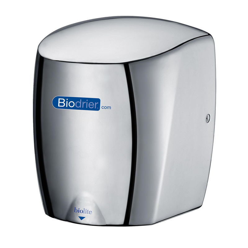 Biodrier Biolite is a jet hand dryer, which uses powerful streams of air to dry hands. This hand dryer offers cool air and warm air drying settings. The warm air setting is ideal for locations that have a lower ambient temperature, and the cool air setting is the perfect choice for those looking to keep energy consumption to a minimum. The Biodrier Biolite has been designed to save energy. This high quality Biodrier hand dryer is so efficient it was independently chosen by the Department of Energy and Climate Change and installed in their London offices. This hand dryer operates using both hot air and cold air, and keeps energy consumption to a minimum with both settings. The hot air setting uses 900W and the cool air function uses just 650W. While this electric hand dryer uses more energy generating warm air, the Biodrier Biolite still keeps consumption to a minimum, and is one of the most environmentally friendly and efficient, warm air hand dryers on the market. There is additionally a 60 second automatic shut off for this jet hand dryer to ensure there isn’t any power wastage. This model of Biodrier hand dryer is designed for fast, powerful blasts of air to dry hands effectively. The concentrated air power propels water off the hands, whilst the hot air function additionally has the capability of evaporating water away. * Three year on site warranty – with a further two years parts * 10 seconds dry time – fast operation * 900 watts – energy efficient * 76 dBa – noise level * Blue Light Airflow indicator – guides user * Die Cast Aluminium cover – durable finish | Biodrier Biolite 900W Automatic Hand Dryer in Chrome | Aluminium