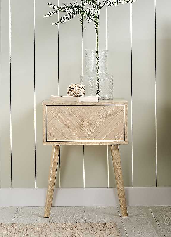 Inspired by the symmetry and precision of classic chevron patterns, Herringford brings an element of architectural finesse to your bedroom. Thoughtfully constructed from high-quality manufactured wood , finished with a laminated oak effect that captures the essence and visual warmth of real wood. Transform your bedroom into a sanctuary of ordered beauty creating a serene retreat with its cohesive design that speaks to both contemporary tastes and classic sensibilities.The Herringford 1-Drawer Bedside table offers a blend of aesthetic charm and practicality, its design resonating with the sleek, modern appeal of the entire range.Weight of Product: 7kgSuggested Number of People for Assembly: 1/2Tool Kit Included: YesSelf-AssemblyManufacturer's 1 year guaranteeWipe clean only, avoid household cleaners/abrasivesManufactured WoodOverall assembled dimensions approx. 54H x 40W x 38D cmPlease remember to measure your available space before ordering. If using on an un-carpeted floor we recommend rubber or felt protection pads be used under the legs to avoid damage to your floors.