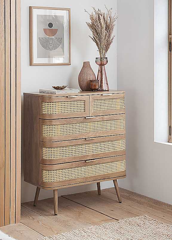 Embrace timeless sophistication with this exquisite Noah 5 Drawer Chest, a testament to understated elegance. This beautifully crafted range exudes a harmonious blend of traditional artisanship and contemporary aesthetics, designed to infuse any space with a serene and refined ambiance. Each curve is thoughtfully softened, featuring delicate bevels that whisper a modern sensibility. The rattan front is meticulously woven, presenting a pattern that is both eye-catching and gracefully reserved.The warm, neutral palette ensures versatility, while the smooth wooden surfaces invite a tactile experience. Ideal for those who appreciate the subtlety of design, this range promises to elevate your home with its timeless charm and a whisper of modernity.Brand: BirleaWeight of product: 33 kgSuggested number of people for assembly: 1Tool kit included: YesSelf-AssemblyManufacturer's 1 year guaranteeProduct care: Wipe clean only, avoid household cleaners/abrasivesSpecifications material: MFCDimensions approx. 96D x 85W x 40D cmPlease remember to measure your available space before ordering. If using on an un-carpeted floor we recommend rubber or felt protection pads be used under the legs to avoid damage to your floors.The images of the products on our website are for illustrative purposes. We endeavour to display as accurately as possible the colours of our products on our website, however, as different computers and mobile devices display colour tones differently we cannot guarantee the complete accuracy of the pictures or photographs that are shown.