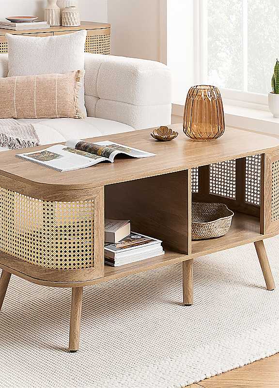 Embrace timeless sophistication with this exquisite Noah Coffee Table, a testament to understated elegance. This beautifully crafted range exudes a harmonious blend of traditional artisanship and contemporary aesthetics, designed to infuse any space with a serene and refined ambiance. Each curve is thoughtfully softened, featuring delicate bevels that whisper a modern sensibility.The rattan front is meticulously woven, presenting a pattern that is both eye-catching and gracefully reserved. The warm, neutral palette ensures versatility, while the smooth wooden surfaces invite a tactile experience. Ideal for those who appreciate the subtlety of design, this range promises to elevate your home with its timeless charm and a whisper of modernity.Brand: BirleaWeight of product: 15 kgSuggested number of people for assembly: 1/2Tool kit included: YesSelf-AssemblyManufacturer's 1 year guaranteeProduct care: Wipe clean only, avoid household cleaners/abrasivesSpecifications material: MFCDimensions approx. 49H x 110W x 55D cmPlease remember to measure your available space before ordering. If using on an un-carpeted floor we recommend rubber or felt protection pads be used under the legs to avoid damage to your floors.The images of the products on our website are for illustrative purposes. We endeavour to display as accurately as possible the colours of our products on our website, however, as different computers and mobile devices display colour tones differently we cannot guarantee the complete accuracy of the pictures or photographs that are shown.