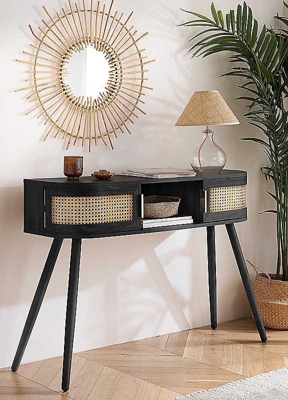 Embrace timeless sophistication with the exquisite Noah design, a testament to understated elegance. This beautifully crafted range exudes a harmonious blend of traditional artisanship and contemporary aesthetics, designed to infuse any space with a serene and refined ambiance. Each curve is thoughtfully softened, featuring delicate bevels that whisper a modern sensibility. The rattan front is meticulously woven, presenting a pattern that is both eye-catching and gracefully reserved. The warm, neutral palette ensures versatility, while the smooth wooden surfaces invite a tactile experience. Ideal for those who appreciate the subtlety of design, this range promises to elevate your home with its timeless charm and a whisper of modernity.Weight of Product: 13kgSuggested Number of People for Assembly: 1/2Tool Kit Included: YesSelf-AssemblyManufacturer's 1 year guaranteeWipe clean only, avoid household cleaners/abrasivesManufactured WoodOverall assembled dimensions approx. 83H x 110W x 35D cmPlease remember to measure your available space before ordering. If using on an un-carpeted floor we recommend rubber or felt protection pads be used under the legs to avoid damage to your floors. | office console table,modern wood console table,console desks tables,wood black table,black console table