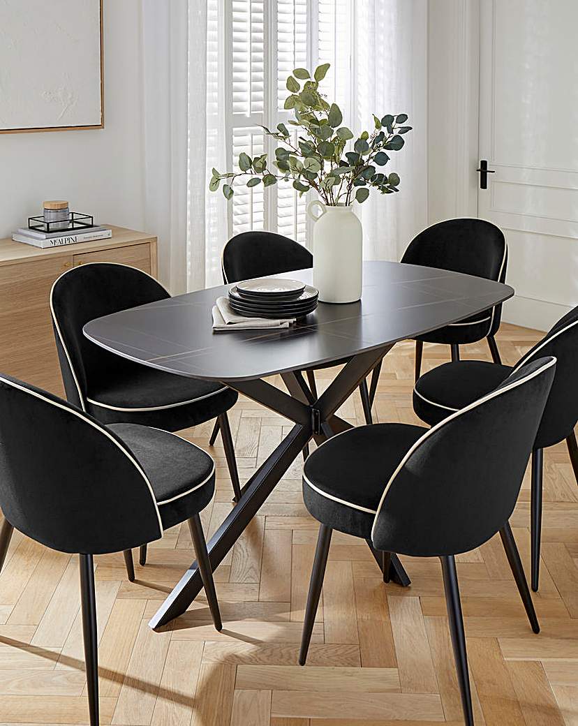 This package includes the Camille dining chairs features contrast piping to combine everyday comfort with on-trend looks. Upholstered in a neutral velvet fabric with black piping, finished with tapered black legs, and the Brock dining table, which has a sintered stone table top, finished with metal legs. self assembly required.