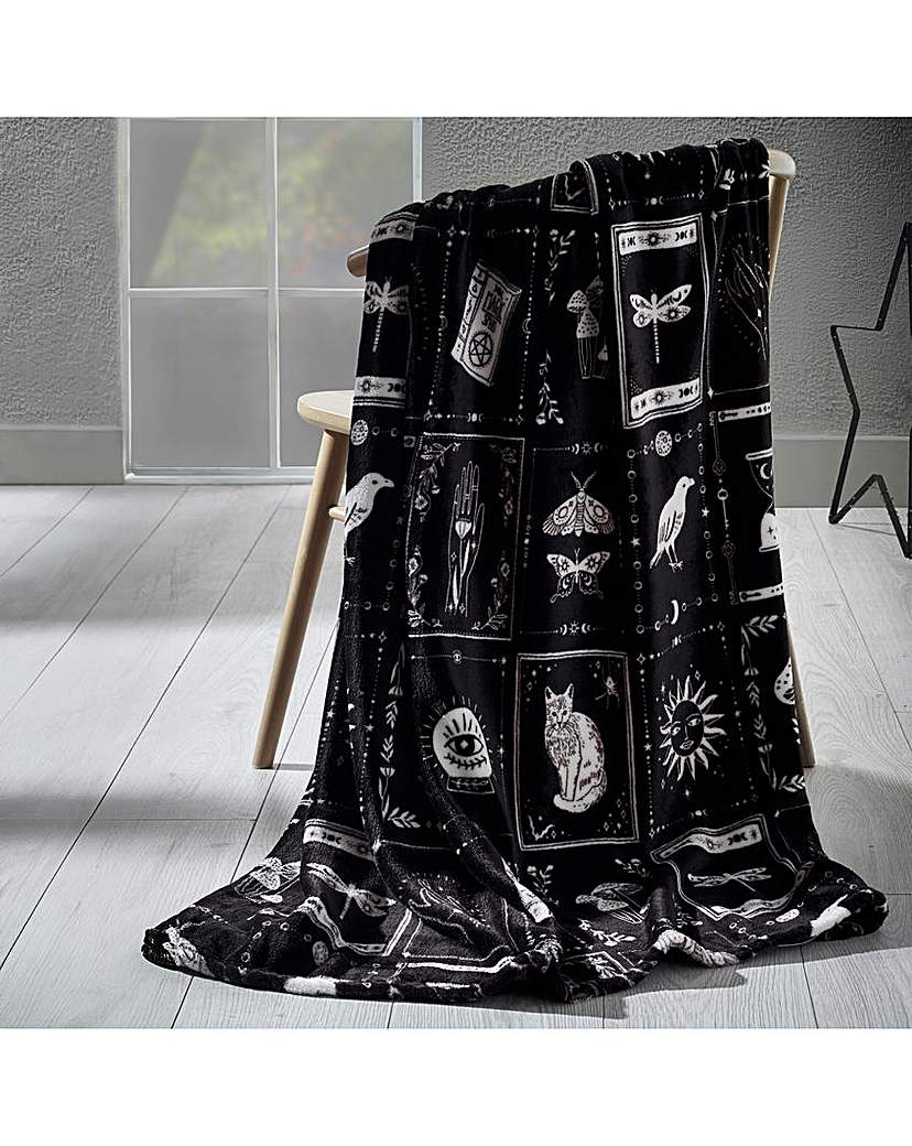 Add a touch of mysticism to your space with the Enchanted Witchcraft throw. Featuring an intricate design of witchy iconography; from black cats and ravens to spell books, potions, and tarot inspired imagery; this throw is perfect for those who love all things magical. The monochrome palette enhances its mystical aesthetic, making it a stylish and statement worthy addition to your home. Crafted for cosy comfort in super soft polyester fleece, this throw is ideal for snuggling up during chilly nights while embracing the enchantment of the unknown.