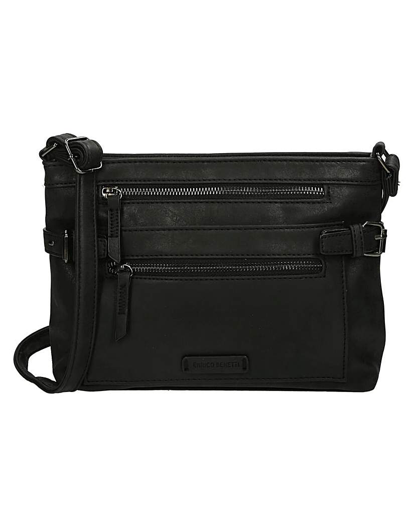 Two front zippered pockets Main compartment with small zip pocket and two slip pockets Back pocket with zipper Adjustable shoulder strap Measures: 26cm x 7cm x 24cm Material: Vegan Leather