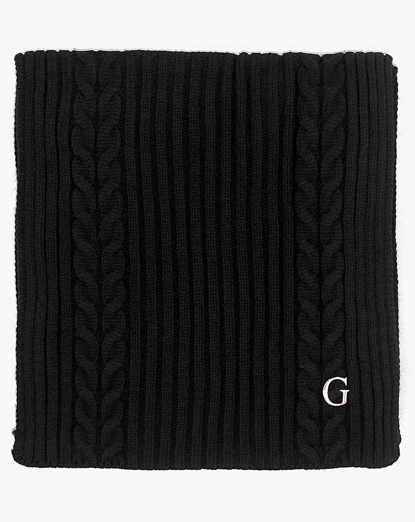 Guess Black Knitted G Logo Scarf Keep warm this Winter Season with the Guess Black Knitted G Logo Scarf. A premium mid-weight knitted rib design with cable inserts. Silver tone Guess 'G' logo completes the design. Technical information: Knitted, Ribbed Design, Cable Inserts, G Logo, Guess Branding
