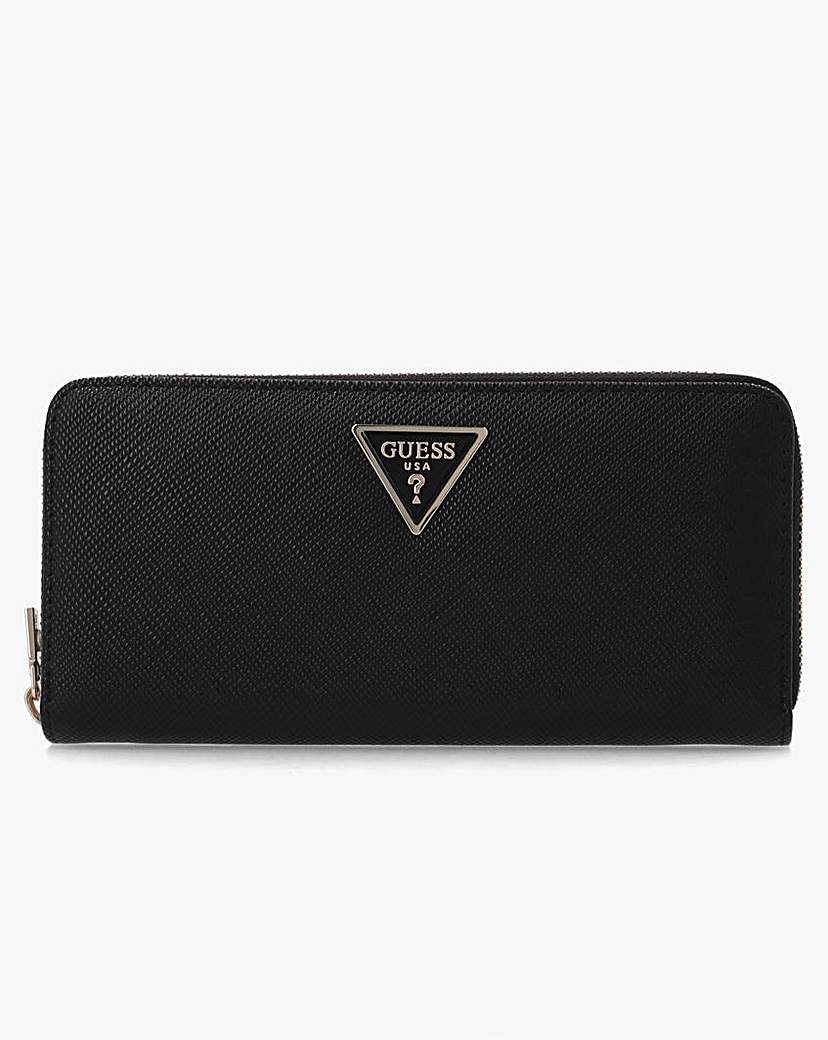 Guess Laurel II Large Black Zip Around Wallet Add the Guess Laurel II Large Black Zip Around Wallet to your accessories collection. This New Season versatile style in a textured design with polished gold tone accents. The secure zip around fastener allows access to multiple handy inner compartments, exterior zip pocket also features. Use it as a wallet or wear with the wristlet strap for an evening look. Iconic triangle logo motif adds detail. Signature Guess branding completes the design. Technical information: Textured Design, Gold Tone Hardware, Zip Around Fastening, Multiple Compartments, Exterior Zip Pocket, Detachable Wristlet Strap, Contains Recycled Plastic, Triangle Logo Motif, Guess Branding, Comes In Gift Box Dimensions: L20 x H10 x D2.5 CM