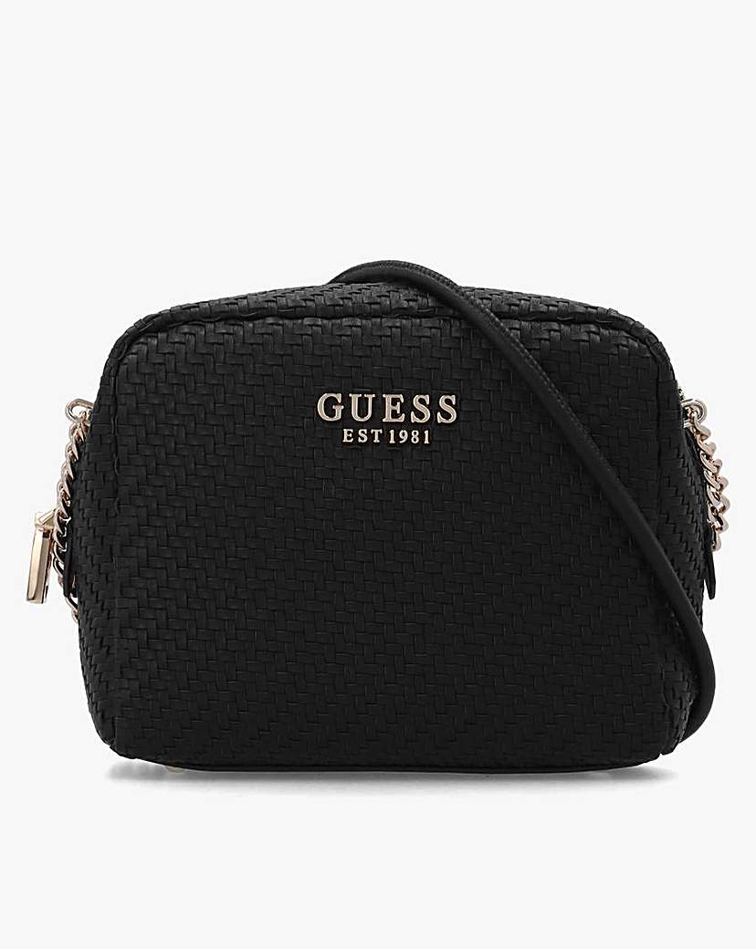 Guess Mirema Small Black Woven Cross-Body Camera Bag The Guess Mirema Small Black Woven Cross-Body Camera Bag is part of the New Season collection. A day to dark style in a chic woven design with polished gold tone accents. The secure top zip fastener allows access to the single main compartment with handy inner zipper and card slot pockets. Carry by the strap on the shoulder or across the body. Signature Guess branding completes the design. Technical information: Woven Design, Gold Tone Hardware, Top Zip Fastening, Single Main Compartment, Inner Zip & Slot Pockets, Long Strap, Guess Branding, Includes Dust Bag Dimensions: L19 x H15 x D7 CM