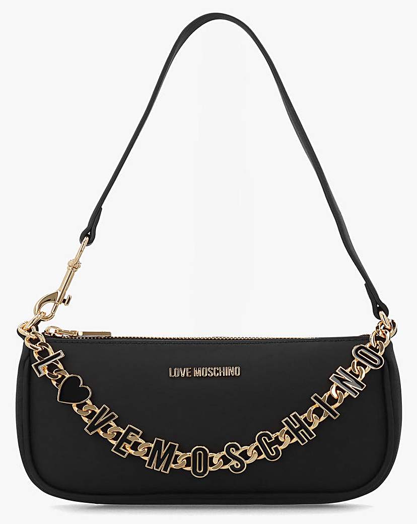 Love Moschino Dangling Logo Chain Black Leather Shoulder Bag Add the Love Moschino Dangling Logo Chain Black Leather Shoulder Bag to your handbag collection. The perfect evening silhouette is crafted from a premium leather material and pleather mix with polished gold tone accents. The secure top zip fastener allows access to the single main compartment with handy inner card slot pocket. Carry by the shoulder strap. Statement chain logo bag charm adds detail. Signature Love Moschino branding completes the design. Technical information: 70% Leather, 30% Pleather, Gold Tone Hardware, Top Zip Fastening, Single Main Compartment, Inner Card Slot Pocket, Shoulder Strap, Chain Logo Bag Charm, Love Moschino Branding, Includes Dust Bag Dimensions: L25 x H12 x D4.5 CM
