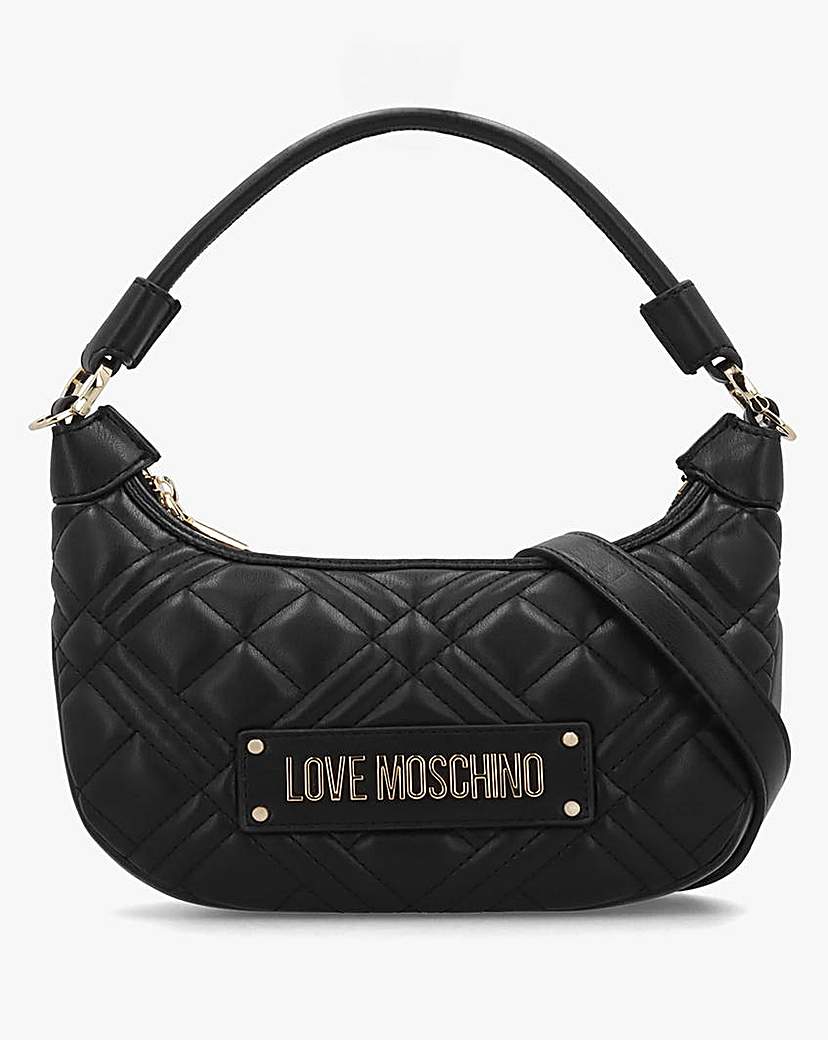 Love Moschino Mini Diamond Quilt Black Hobo Bag Add the Love Moschino Mini Diamond Quilt Black Hobo Bag to your handbags collection. This New Season silhouette is crafted from premium soft diamond quilt PU with polished gold tone accents. The secure top zip fastener allows access to the single main compartment with handy inner slot pocket. Carry by the top handle or the detachable strap on the shoulder or across the body. Classic logo plaque adds detail to the front of the bag. Signature Love Moschino branding completes the design. Technical information: PU, Diamond Quilt Design, Gold Tone Hardware, Top Zip Fastening, Single Main Compartment, Inner Slot Pocket, Top Handle, Detachable Strap, Hobo Silhouette, Logo Plaque, Love Moschino Branding, Includes Dust Bag Dimensions: L22 x H17 x D7 CM