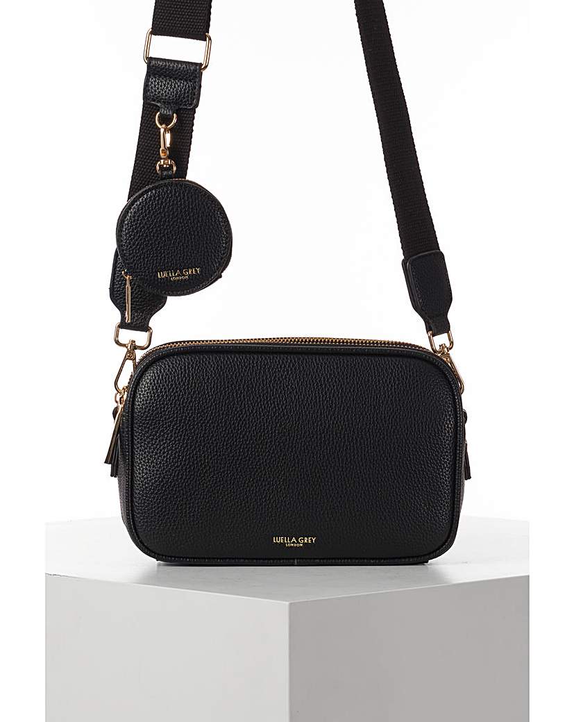 Luella Grey Siobhan Black Crossbody Siobhan is a new addition to our Weekend Edit collection - a classic and practical camera crossbody bag with three compartments. Available in a range of colours, Siobhan's canvas strap features the new circular zip purse charm - Nora. This charm is attached by a detachable clip that allows you to 'clip and go'. Nora is brilliant for keeping vital things close to your body and safe. Outer: 100% Polyurethane. Lining: 100% Polyester. Outer: 100% Polyurethane. Lining: 100% Polyester. Height: 14cm, Width: 22.5cm, Depth: 7cm. Handle drop 50-60cm (adjustable).