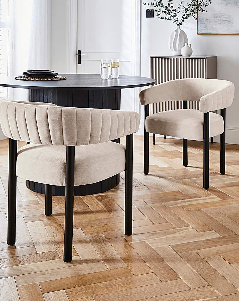 Lindsay Upholstered Pair of Dining Chairs. Pair of Dining Chairs. Natural Back and Seat, Velvet look upholstered, Black legs, Self assembly required, Fittings included, 1 Year Manufacturers guarantee
