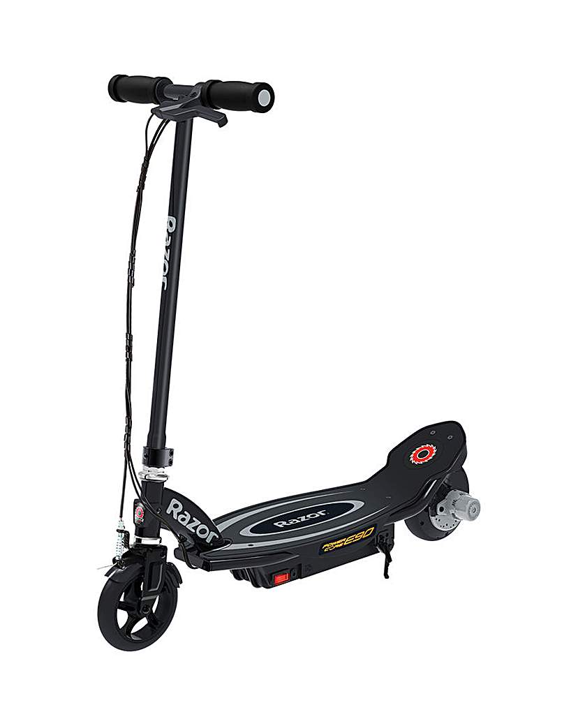 Power-up Your Ride. The black Razor Power Core E90 is upping the ante for electric scooters once again, rolling out an amazing 65 minutes of continuous ride time and fifty percent more muscle power. Its innovative hub motor delivers a more efficient, maintenance-free ride (no alignment, no chain, no belt), while the steel frame, lighter weight and increased torque take performance to the next level. With a max speed of up to 10 mph. It has a push-button accelerator, a hand operated front brake, a spoked, urethane front wheel with an abrasion-resistant, airless, flat-free tyre at the rear and it also has a retractable kickstand and comes with a 12 volt rechargeable battery and charger. Suits ages 8 years plus.