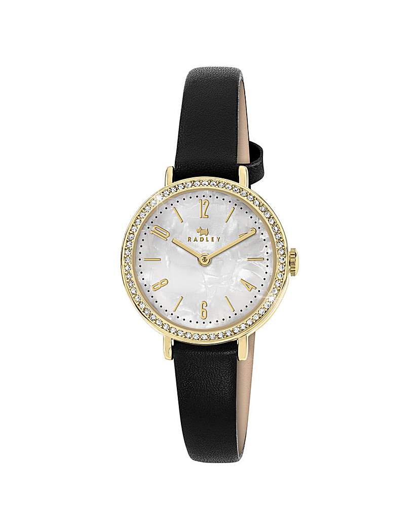 Radley Stone Set Black Leather Watch Radley Windsor Lane Stone Set Black Leather Strap Watch. Featuring a 26mm Czech stoneset case which showcases a striking white mother of pearl effect dial. The watch is finished with a soft black genuine leather strap and fastened with polished gold buckle. Polished Pale Hamilton Gold Stone Set Case Presented in Official Radley Packaging Dimensions: 17.5 x 2.6 x 1