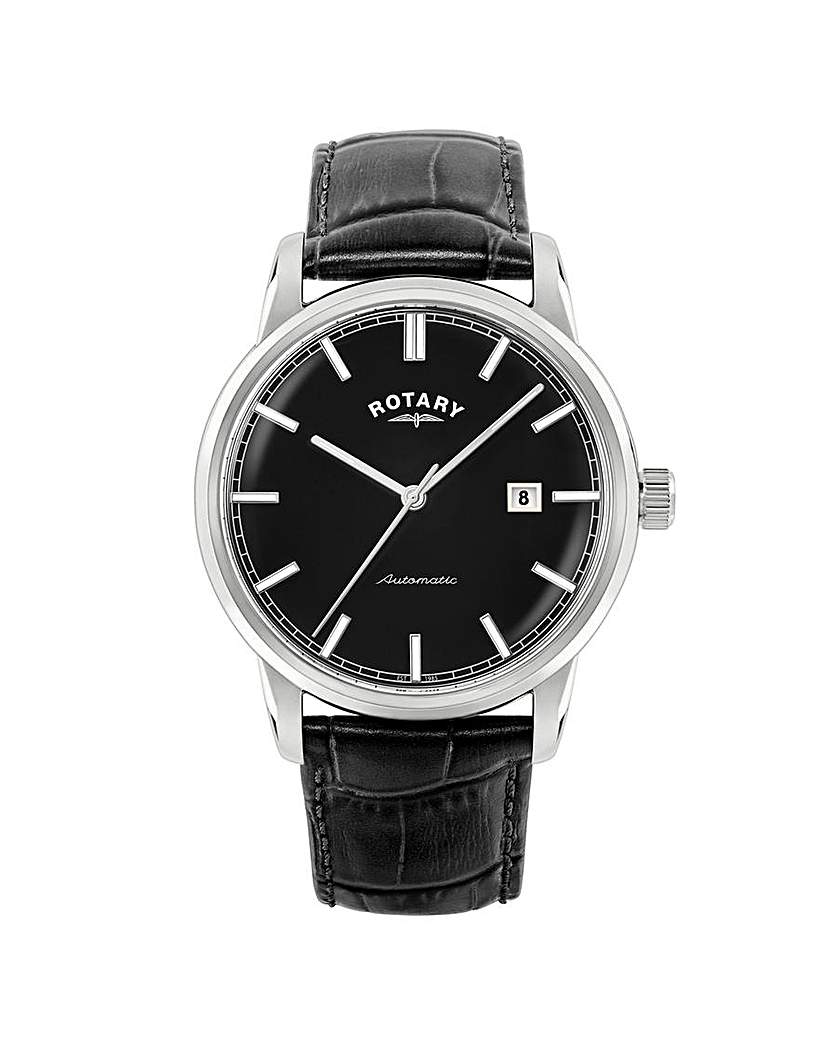 Rotary Men's Automatic Black Strap Watch The Rotary Heritage Automatic is a tribute to the sleek simplicity of mid-century watch design, blending vintage charm with contemporary watchmaking. Housed in a polished 40mm stainless steel case, this timepiece takes inspiration from the refined lines and proportions of 60s watch design, reimagined for the modern day. At its heart is the dependable Miyota calibre 8215 automatic movement, offering a 42-hour power reserve and smooth, self-winding performance you can rely on. The clean black dial is accented by applied stainless steel indices and a subtle date complication at 3 o'clock, all framed under vintage inspired mineral glass. The black leather strap, embossed with a crocodile-grain texture, adds a touch of classic sophistication, while 50 metres of water resistance ensures it's ready for everyday wear - rain or shine. The Rotary Heritage Automatic is a watch for those who appreciate timeless design, mechanical integrity, and the reliability of a well-made automatic movement. Heritage - Automatic Presented in Official Rotary Packaging Dimensions: 25.4 x 4.1 x 1.3