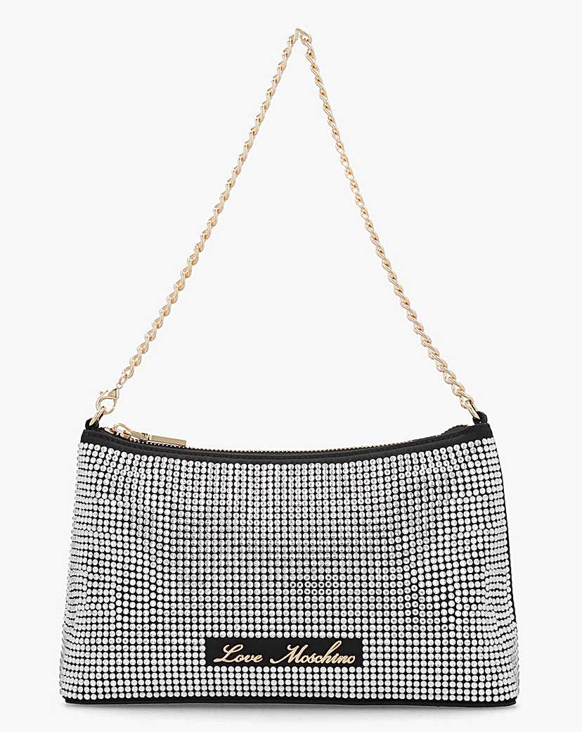 Love Moschino Diamante Overlay Black & Silver Shoulder Bag Add the Love Moschino Diamante Overlay Black & Silver Shoulder Bag to your handbag collection. This evening occasion wear style is crafted from a premium satin look fabric overlayed with diamante embellishment and features polished gold tone accents. The secure top zip fastener allows access to the single main compartment with handy inner zipper and slot pockets. Carry by the curb chain strap on the shoulder. Script style logo adds detail to the front of the bag. Signature Love Moschino branding completes the design. Technical information: Fabric, Diamante Overlay, Top Zip Fastening, Single Main Compartment, Inner Slot Pocket, Inner Zip Pocket, Chain Shoulder Strap, Script Logo, Love Moschino Branding, Includes Dust Bag Dimensions: L26 x H15.5 x D7 CM