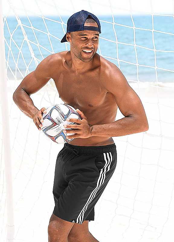 Sporty black swim shorts with the iconic three white stripes down the leg. Also comes with side pockets, outer drawcord and inner lining for great comfort and coverage on the beach and in the water! adidas Performance Swim Shorts Features: Colour: Black Washable 100% Polyester (Recycled Polyester) Lining: 100% Polyester (Recycled Polyester) Inside leg approx. 50 cm (19½ in)