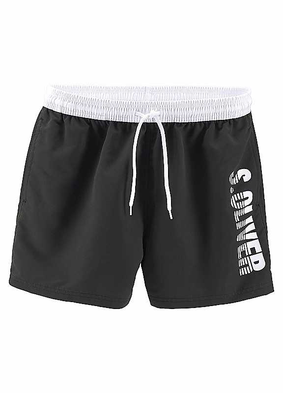 Comfortable and stylish black shorts featuring contrast white waistband and logo print down one leg. The waistband is elasticated with adjustable drawstring, practical side pockets, back pocket with Velcro and inner slip.s.Oliver Red Label Swim Shorts Features:/h2> Colour: Black Washable 100% Polyester Inner Slip: 100% Polyester Short inside leg approx. 37 cm (14½ in) Long inside leg approx. 47 cm (18½ in)