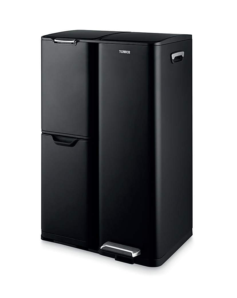 Tower Recycling Pedal Pin with Three Individual Compartments 1x 13L Compartment, 1x 17L Compartment, 1x 30L Compartment, Three Inner Buckets, Carbon Steel Body, 60L, Black. Hygienically dispose of your household waste with the 60L Pedal Recycling Bin from Tower. It features a pedal opening system to pop the lid open with ease, perfect for hygienic and hands-free opening. The spacious capacity is ideal for busy households and provides plenty of space to dispose of waste, ensuring you won't have to constantly empty the bin.