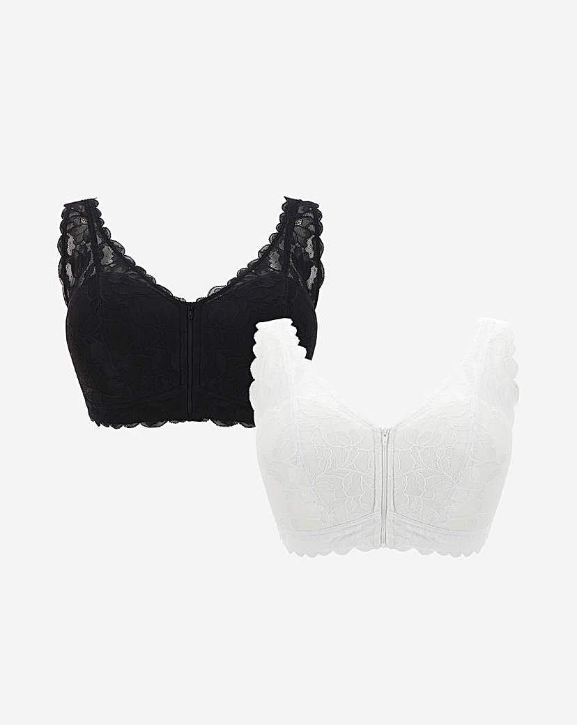 Black/White 2 Pack Zip Front Lace Trim Comfort Bras