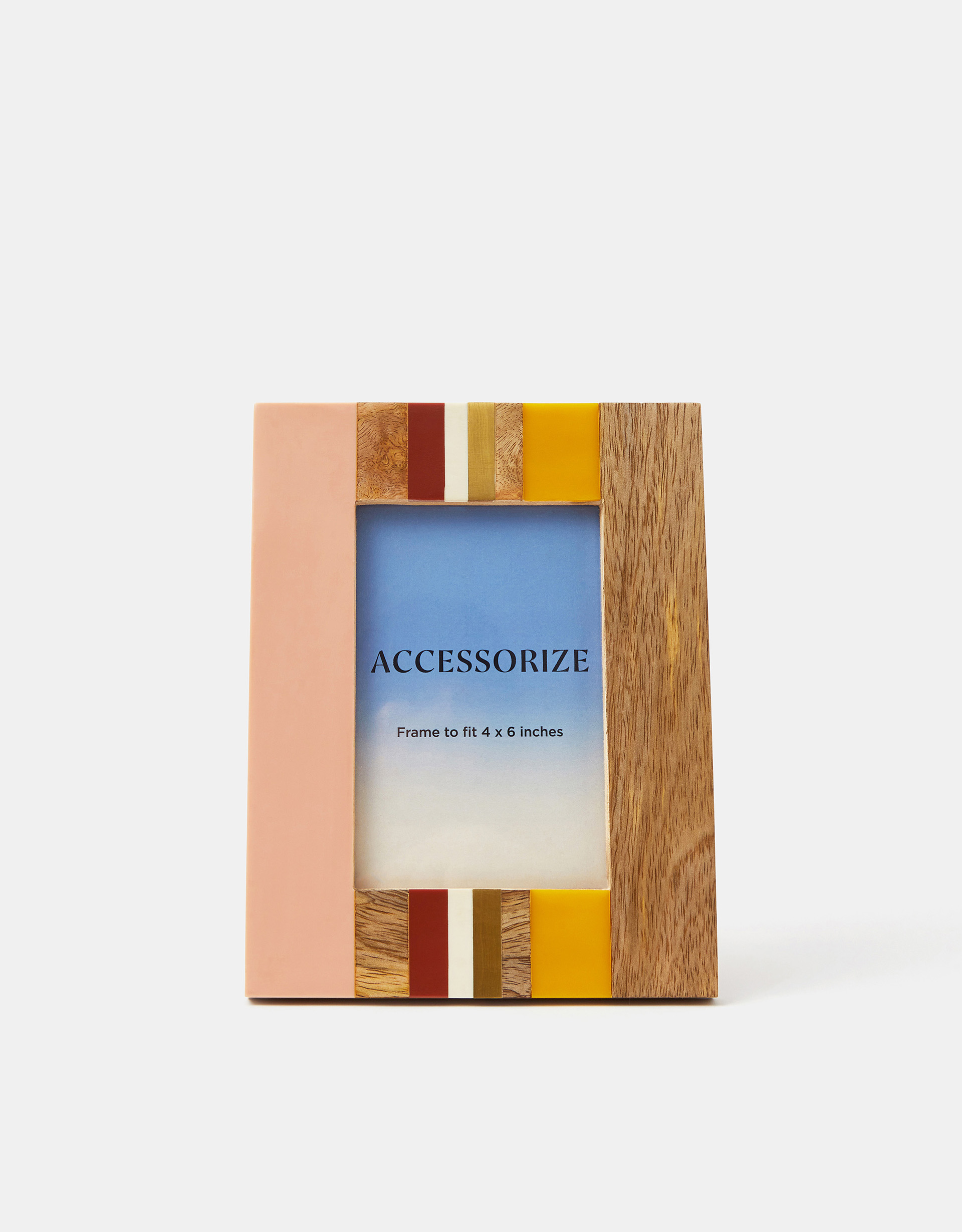 Designed with a thick border of colourful stripes and wooden finishes, this photo frame adds a pop of colour to your living space. Fits a 4inch x 6inch photo and can be displayed both portrait and landscape.
