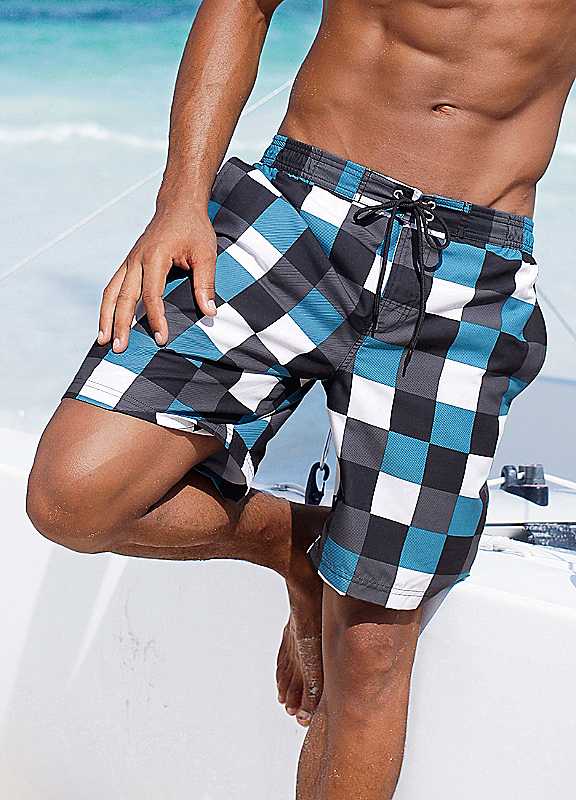Blue checkerboard swimming shorts with inner slip, inner pocket and elastic waistband with outer cord. Great for battling the waves and the crowds at the beach bar.Buffalo Shorts Features: Colour: Blue Check Washable 100% Polyester Length in size M approx. 49 cm (19 in) Soft microfiberProtect your Skin