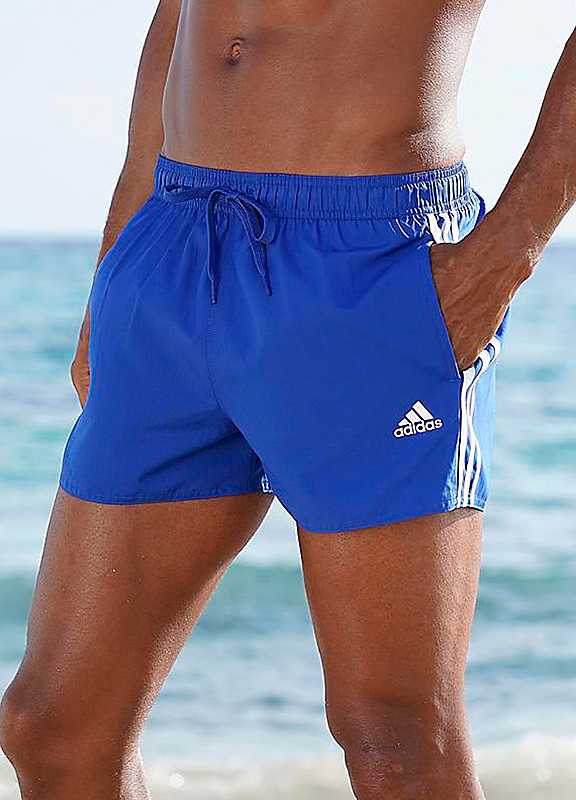 These iconic blue swimming shorts in a short cut are must-haves for the beach, lake or swimming pool. The design features three brand-typical stripes a comfortable elastic waistband with drawstring and side pockets to round off the look. Combine with a vest top and trainers until you are ready to jump into the pool! adidas Performance Swim Shorts Features: Colour: Blue Washable 100% Recycled polyester Length approx. 34 cm (13½ in)