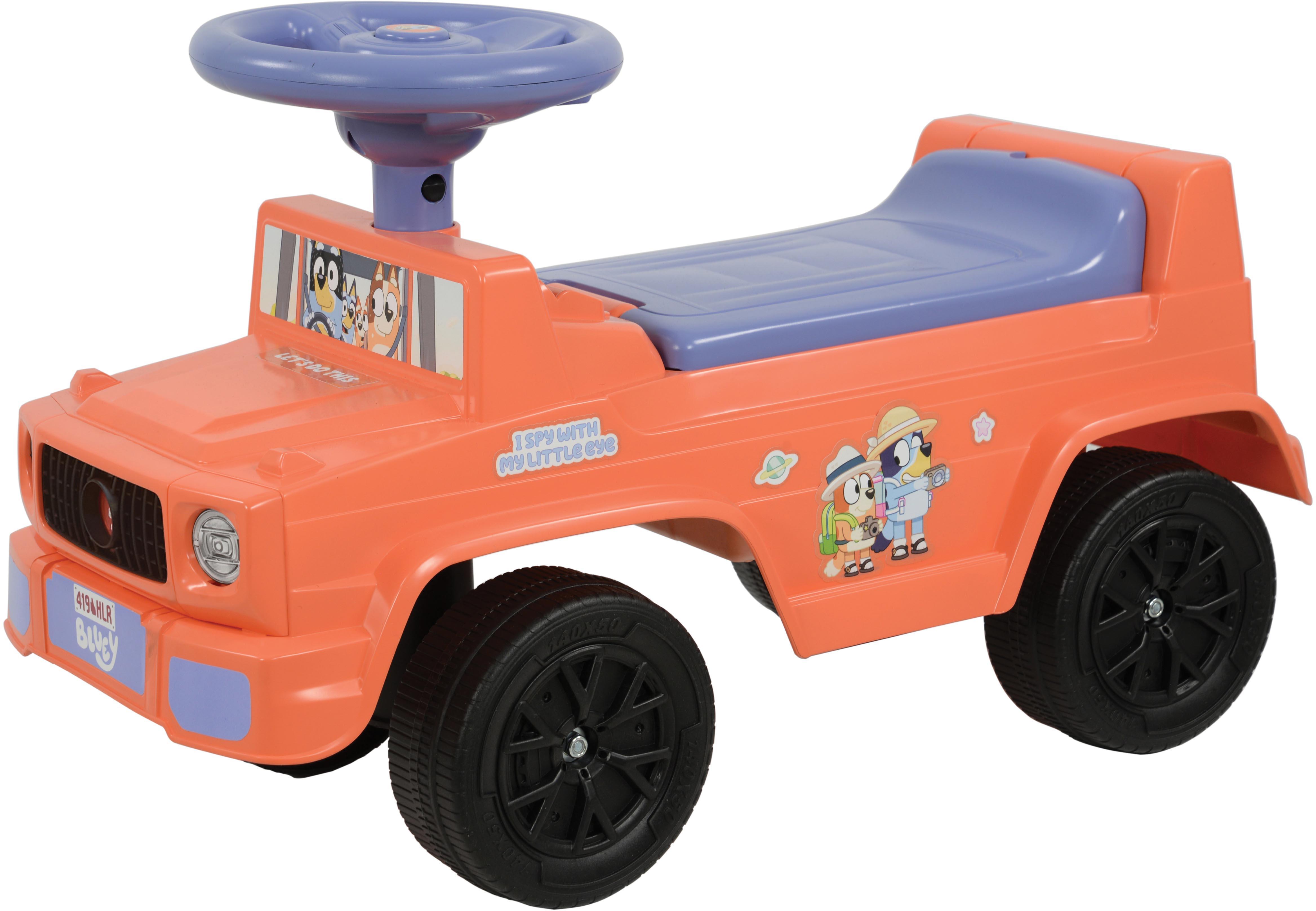 Buckle up for a barking good time with the Bluey 4X4 Ride-On! This paw-some ride is officially licensed with Bluey, featuring bright decals and components that will make your little one's buzz with excitement! An ideal first foot to floor ride on, your child will be zooming around in style. Equipped with working horn and sounds this ride-on is ready for any adventure! The chunky, deep tread tires provide stability and optimal grip, ensuring a smooth ride on any terrain. The comfortable moulded seat and backrest make for a cozy ride, perfect for developing balance and coordination. Whether it's a birthday or Christmas, this ride-on is the ultimate gift for any Bluey fan. So, hop on board and let the fun begin - it's time to go on a wild ride with Bluey!