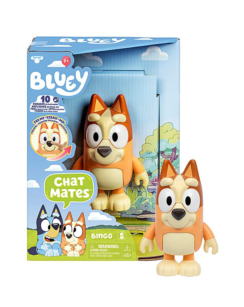 Play out all the fun of Bluey with the new Bluey Chat Mates Bingo figure! Bingo comes to life with a press of her nose! Hear 10 fun, fan-favorite phrases, including some of her most iconic lines. At 5.5-inches (14cm) tall, Bingo is the perfect size for little hands and has articulated arms and legs for play and posing. Children will love using these figures to recreate some of the most memorable moments from the show and make up new adventures. Collect all the Bluey Chat Mates and build up the world of Bluey at home!