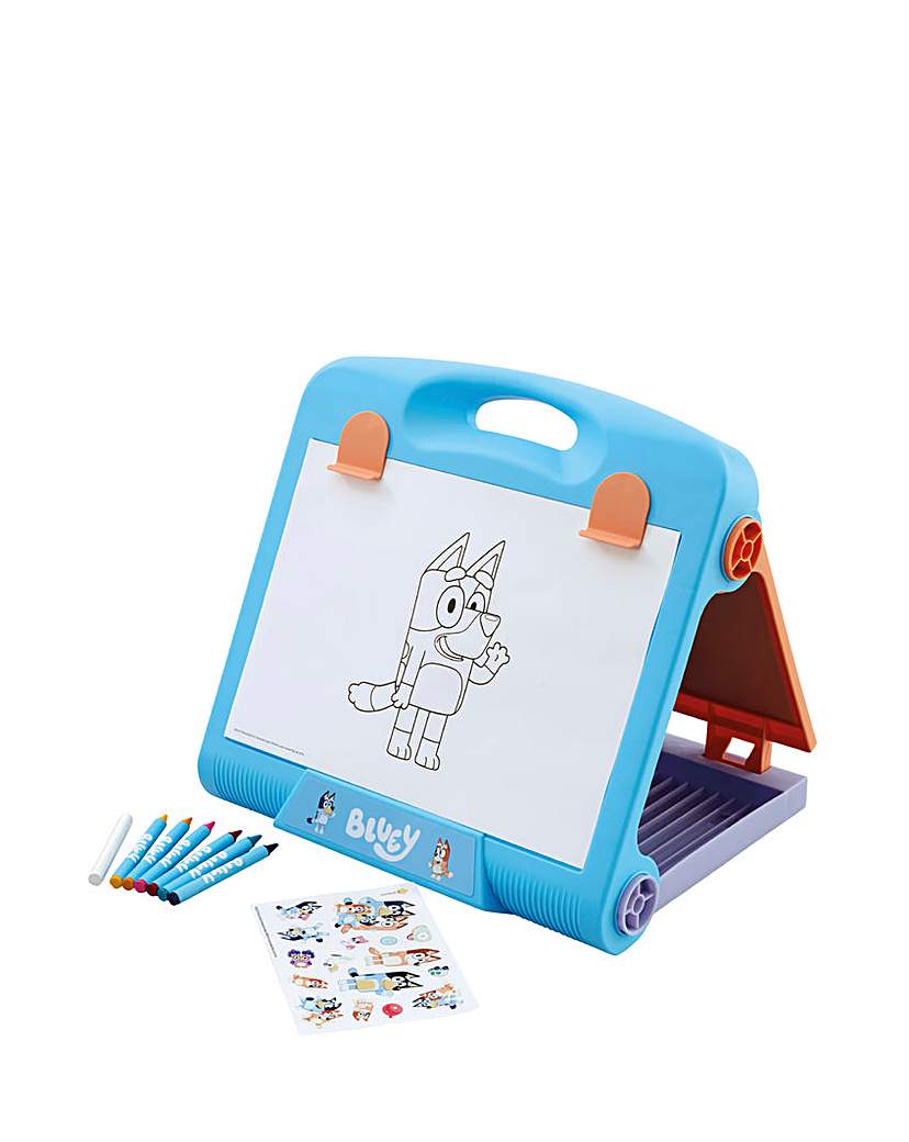 Chunky & handy 2-in-1 Bluey desktop chalk and drawing board. Pop it open and clip your paper into the handy clips to create an instant easel for drawing and colouring. Turn the easel around, and you'll have a fun chalk board to create your own Bluey doodles on! Includes 1 chalk, 6 crayons, 3 A4 colour in sheets, and 1 sticker sheet. When you have finished, fold it down for tidy play. Perfect for encouraging creative play in a mess-free way!