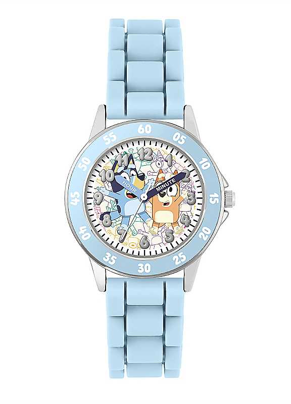 Bluey Time Teacher Silicone Strap Analogue Watch. This time teacher Bluey watch has a 3-hand hand analogue dial featuring the adorable duo Bluey and Bingo, a time-teaching feature, easy to read numbers and a blue silicone strap with traditional buckle fastening for added comfort. Packed on a branded backing card and comes with a one year guarantee.Bluey themed dialTime teaching handsEasy to read numbersSilicone