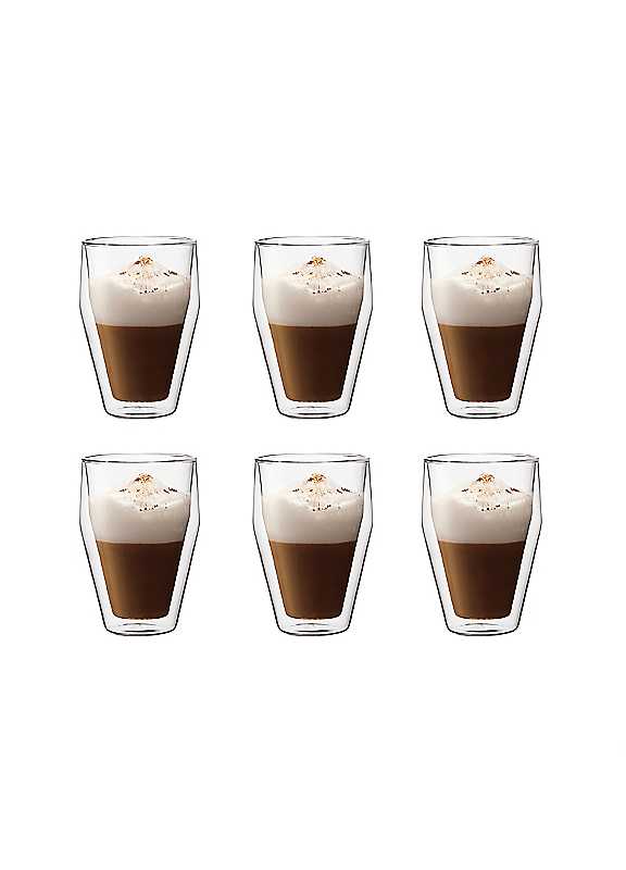 About the Titlis Double Wall Drinking Glass SetSpecial occasions deserve special drinkware - and the Titlis double wall drinking glass is sure to wow your guests. These classy tumblers catch the eye with their unique shape and innovative double-wall construction, which creates an optical illusion that makes the contents appear as if gracefully floating in the glass.Individually mouth-blown from heat-resistant borosilicate glass, the Titlis double wall drinking glass offer a thermal insulation that keeps hot and cold drinks at their optimum temperature for longer, while regulating the external temperature of the glass.Best of all, these shapely glasses enhance the presentation of your drinks, so they look as good as they taste. From coffee, cocoa and tea to cold brew, cocktails and chilled desserts, these double wall drinking glasses will bring an element of luxury into your home.Set of double wall drinking glasses.Innovative double wall design that keeps hot drinks hot and cold drinks cold.Also perfect for serving soup or cold desserts.Made of mouth-blown, heat-resistant borosilicate glass.Hydrophobic silicone vent that equalizes the air pressure between the two layers of glass.Unique shape means glasses can be stacked for convenient storage.Dishwasher, microwave and oven safe (up to 350°F/176°C).6 piece setUse & Care: Wash in warm, soapy water before first use & dry thoroughlyFor all subsequent uses, wash & dry by hand or pop in the dishwasherTitlis double wall glasses are safe to use in the freezer, oven & microwaveBorosilicate Glass & SiliconeDimensions approx. 12.6H x 8.7W x 8.7D cm