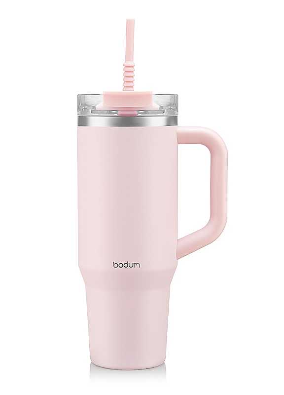Ideal for the daily commute, holidays, the gym or simply walking the dog, the Bodum Travel Mug with Handle and Silicone Straw is designed to go wherever you go, ensuring that your coffee, tea or other favourite drink is always within reach, even when you're far from home.Central to the Travel Mug's stylish, streamlined design is our innovative, insulating double wall system. It keeps hot and cold beverages at their best, so you can savour every sip. Rest assured that the exterior stays cool even when the contents are piping hot. Durable and robust, this stainless steel travel mug have an ergonomic handle for comfortable carrying, and has a secure lid with a silicone straw.The combination of style and high capacity make this one of the best travel mugs for any journey. What's more, you can enjoy every drink more knowing that you've swapped single-use cups for a long-lasting, more eco-friendly alternative.Available in a range of colours, your Travel Mug is as individual as you are.Travel Mug with handle & silicone straw, 1.2L/ 40 oz in Belly BandUse & Care: Clean the stainless steel travel mug after each useStainless Steel, Plastic, Rubber, Silicone