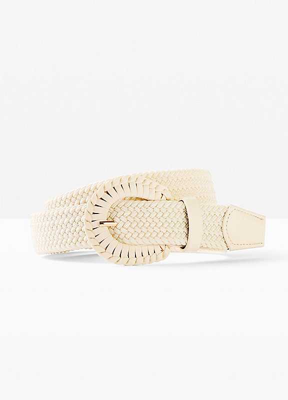 Elevate your outfit with our elasticated braided belt, featuring a stylish design and comfortable fit. Perfect for adding a touch of style to any look, this belt is made with high-quality fabric and is durable for long-term wear. The elasticated design allows for a customizable fit and ensures all-day comfort. Whether you're dressing up or keeping it casual, this belt is the perfect accessory for any occasion. Upgrade your wardrobe with our versatile and fashionable braided belt. Outer: 70% Polyester, 30% Elastodiene Buckle: 100% Zinc Width approx. 3.5 cm | braided elastic belt, cream womens belt, braided fabric belt