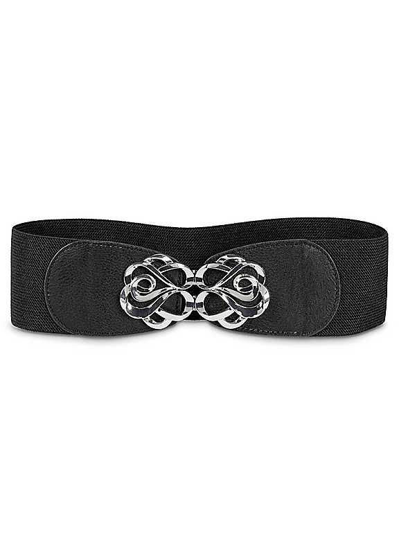 An elasticated belt with an ornate buckle at the front. Brand: bonprix Faux Leather (PU), Metal & Elastane Width approx. 7 cm | elastic buckle belt, faux leather belt, silver metal belt, black elastic belt