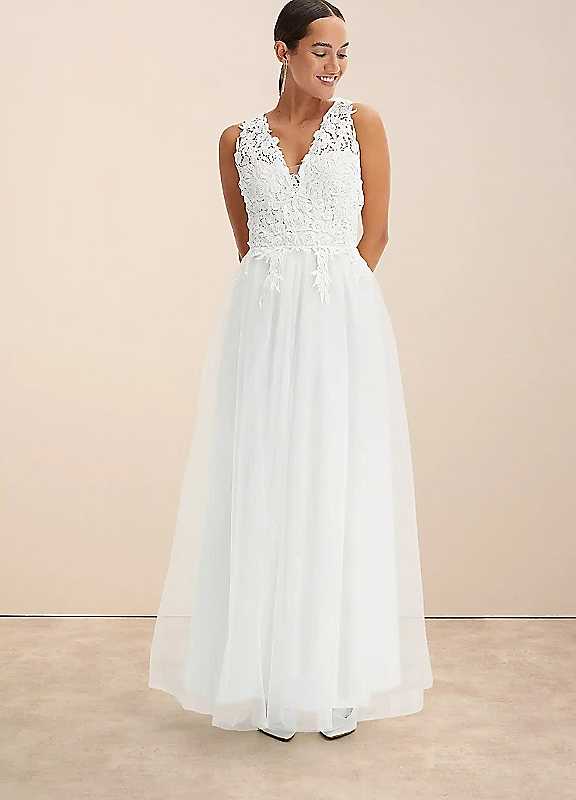 The bonprix Lace Bodice Wedding Dress is a stunning choice for brides seeking elegance on their special day. This gown features a fit and flare silhouette that flatters the figure while providing comfort. The v-neckline adds a touch of sophistication, and the beautiful lace bodice creates a plunging neckline for a bold yet refined look. The full-length chiffon shell skirt cascades beautifully, adding to the romantic feel of the dress.Brand: bonprixMachine washable for convenienceOuter: 100% Polyester for durabilitySkirt: 100% Polyester for a luxurious drapeLining: 95% Polyester, 5% Elastane for comfortRegular length: Approximately 150 cmIt is advisable to size up as European sizing tends to run smaller than UK sizes.