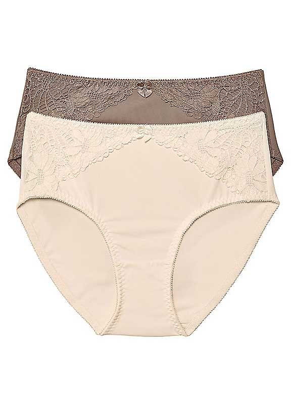 Two pairs of lace trim briefs.Brand: bonprixShell: 82% Polyamide, 18% ElastaneLace: 90% Polyamide, 10% Elastane, Net Lining: 92% Polyamide, 8% Elastane | tight fitting panties, underwear briefs, ladies full briefs, high waisted lace briefs, spandex briefs, lingerie with lace, lace briefs, high waist brief, polyamide briefs, light panties, women's briefs