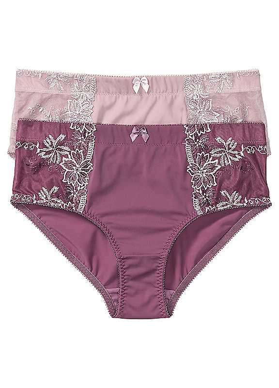 Two pairs of embroidered shaper briefs. Brand: bonprix High waist Outer material: 80% Polyamide (recycled), 20% Elastane Lining: 100% Cotton Please note: This item is small fitting, you may require a larger size. | body shaping briefs, high waist control briefs, high waisted shape wear, shaping high waisted brief, shape wear panty
