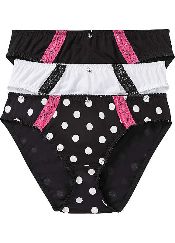 Stylish briefs that have an elasticated waistband and leg openings for comfort and fit, and feature a small anchor detail in the centre along with colour contrasting lace detail. Pack of 3 Washable 90% Cotton, 8% Polyamide, 2% Elastane | polka dot underwear, bikini briefs, high cut briefs, polka dot knickers